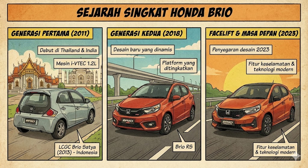 Honda Brio pertama kali diperkenalkan di Indonesia pada tahun 2012 sebagai city car kompak untuk pasar perkotaan. Seiring waktu, Honda Brio mengalami berbagai pembaruan desain dan fitur hingga menjadi mobil yang semakin matang dan diminati.