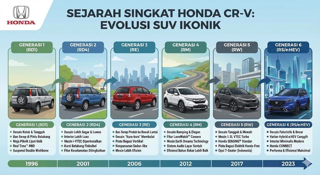 Honda CR-V adalah salah satu SUV paling sukses dan paling dikenal di Indonesia. Nama CR-V sudah identik dengan mobil keluarga yang menawarkan kenyamanan tinggi, kabin luas, mesin tangguh, serta teknologi modern. Dari generasi ke generasi, Honda CR-V selalu menjadi benchmark di kelas SUV menengah.