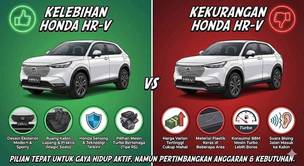 Keunggulan utama Honda HR-V terletak pada desain elegan, kenyamanan kabin, efisiensi bahan bakar, serta pilihan tipe yang beragam, mulai dari yang terjangkau hingga varian tertinggi dengan fitur lengkap.